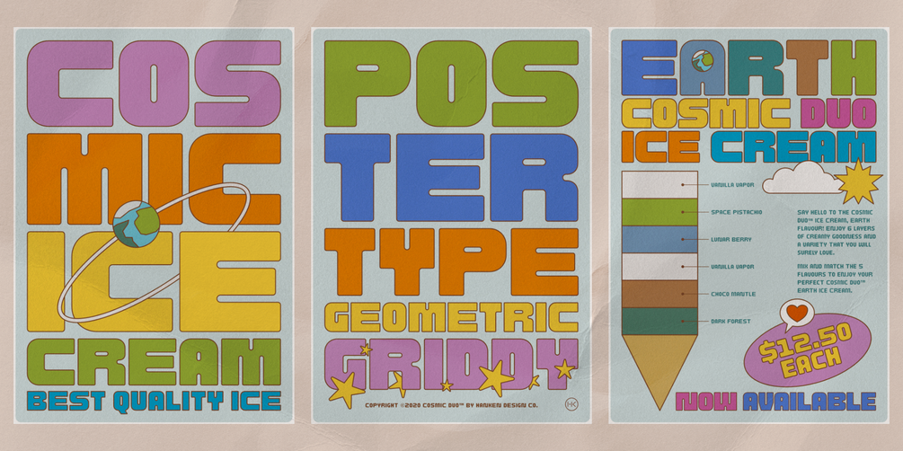 Cosmic Octo is a geometric display typeface for headlines, posters and logos.