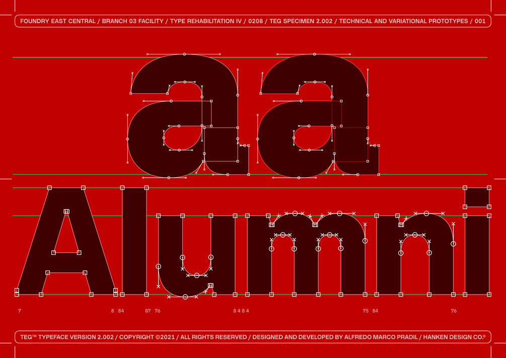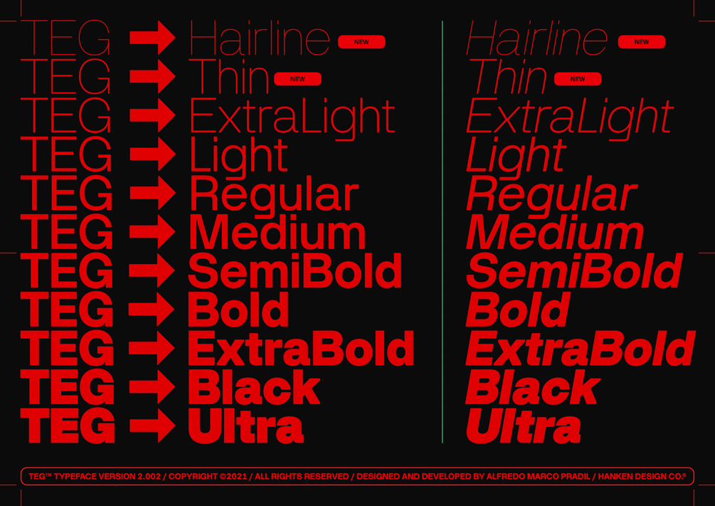 TEG™ is a modern sans serif that bridges the gap between stylistic geo sans and grotesque type design. It has a strong mono-linear design, a combination of sharp, and rounded curves which gives TEG™ a futuristic and classic grotesque feel.